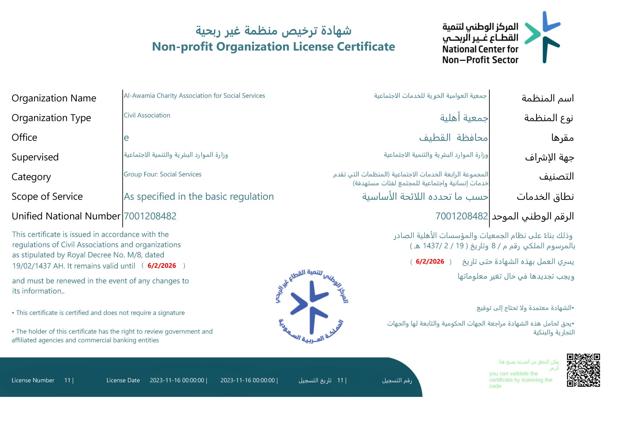 شهادة تسجيل الجمعية